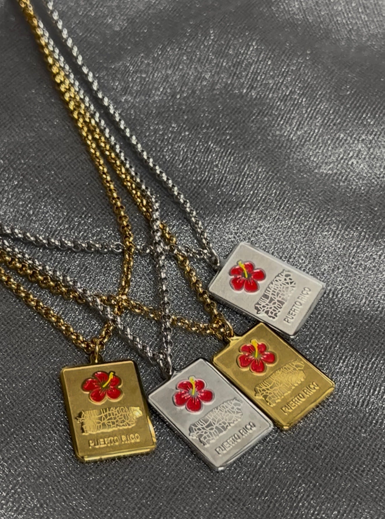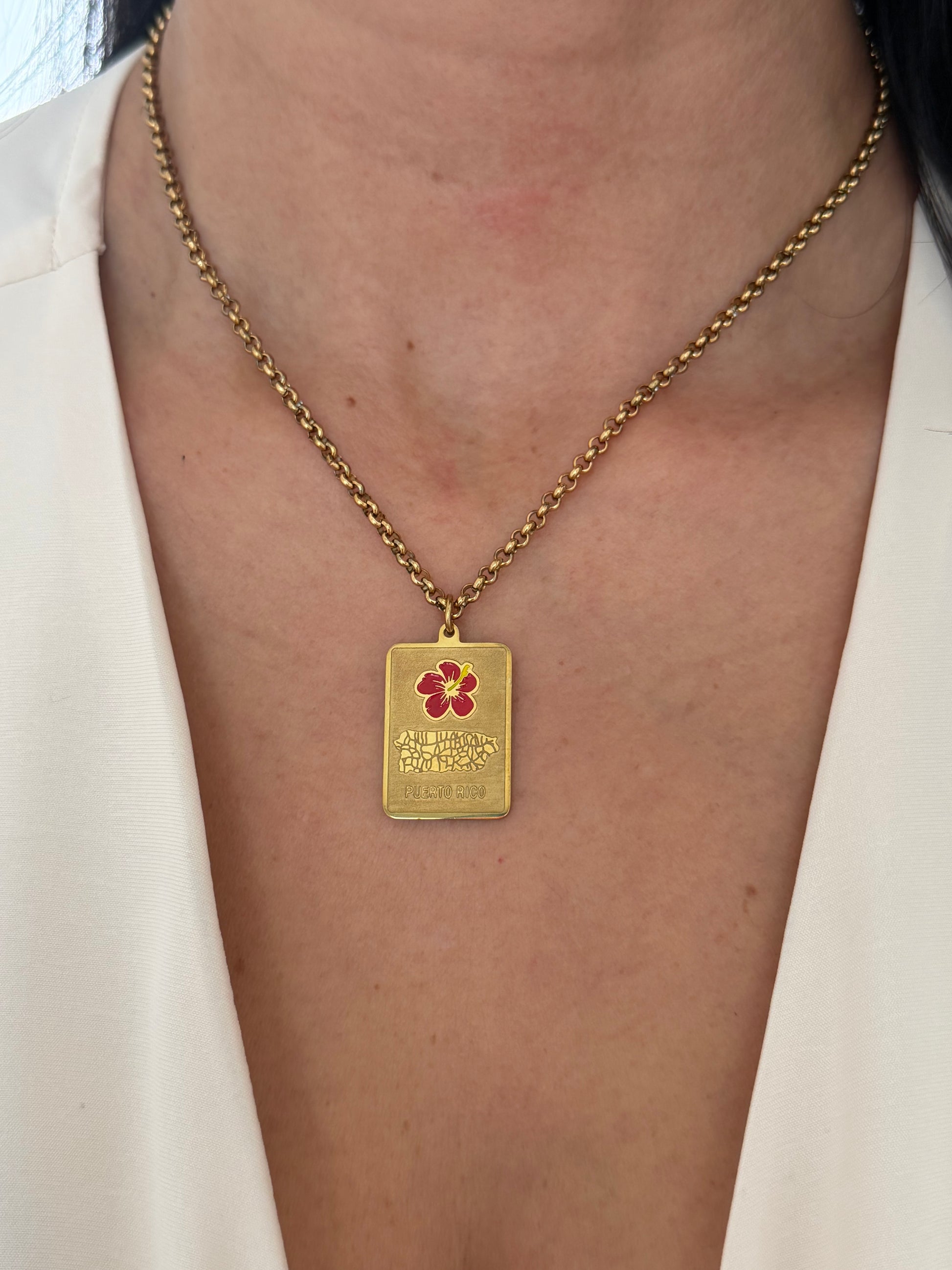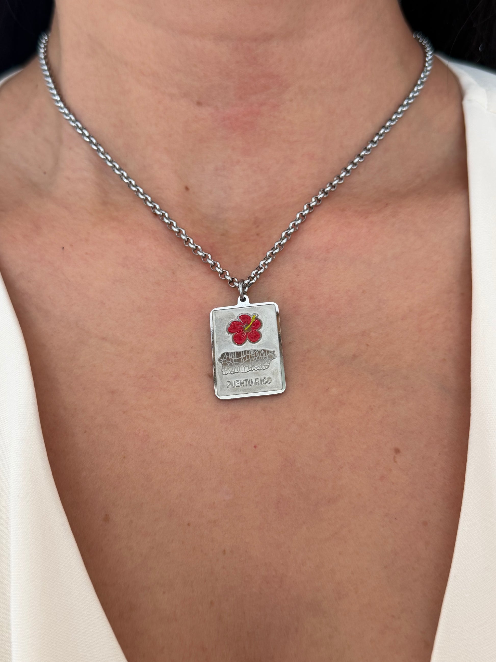 A delicate stainless steel necklace featuring a beautifully crafted Puerto Rico map charm paired with a vibrant amapola flower. A meaningful and stylish piece that celebrates your island pride with a touch of elegance.