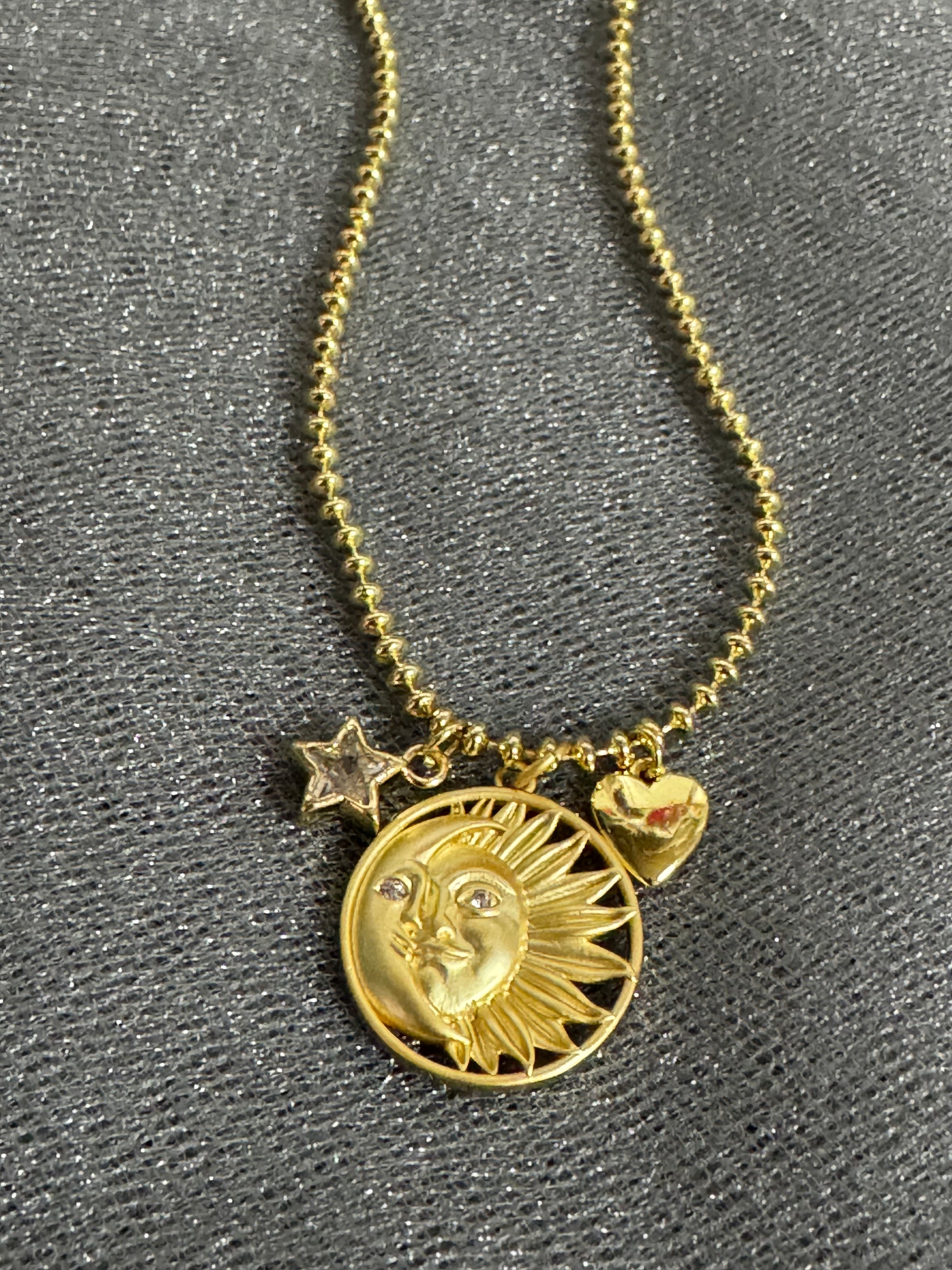 A unique necklace featuring a moon and sun pendant, adorned with a star and a heart, crafted in 18k gold plated. A piece that beautifully blends symbols of light, love, and energy into a meaningful accessory. Lenght 17”+2” extension
